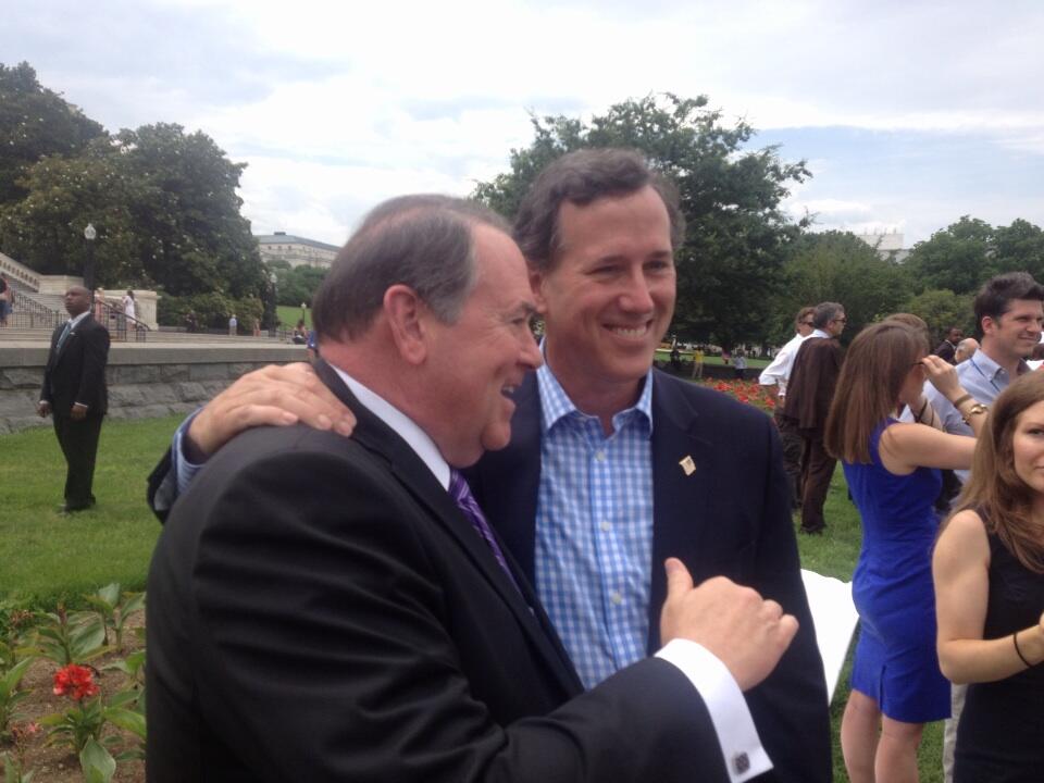 Los dos ex candidatos, que días antes coincidieron en la marcha a favor del matrimonio tradicional (ver foto) , estuvieron en bandos enfrentados en las primarias del martes en Carolina del Sur. El ex Gobernador de Arkansas hizo una visita relámpago el sábado a Spartamburg (ver vídeo) para apoyar a Campbell, quien había sido su jefe de campaña en Carolina del Sur en 2008. Y Santorum visitó Greenville el lunes (ver foto) para participar en varios actos de campaña de McMaster - hombre de McCain en 2008, y de Huntsman en 2012.