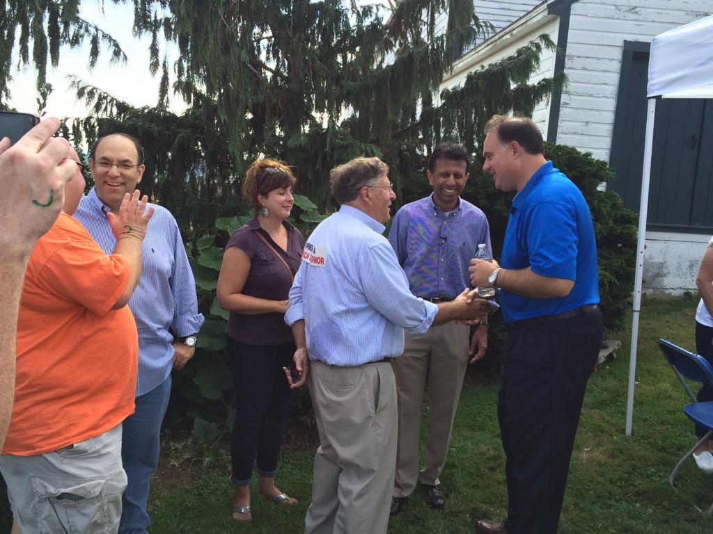 En el picnic de Dover, el gobernador de Louisiana tuvo ocasión de conocer a algunos políticos importantes del estado de granito. Allí estaban, por ejemplo, el ex Gobernador John Sununu (ver foto), y los tres hombres - Scott Brown, Bob Smith, y Jim Rubens - que ayer se enfrentaron en la primaria republicana para ser el candidato al Senado - como se esperaba, ganó Brown.