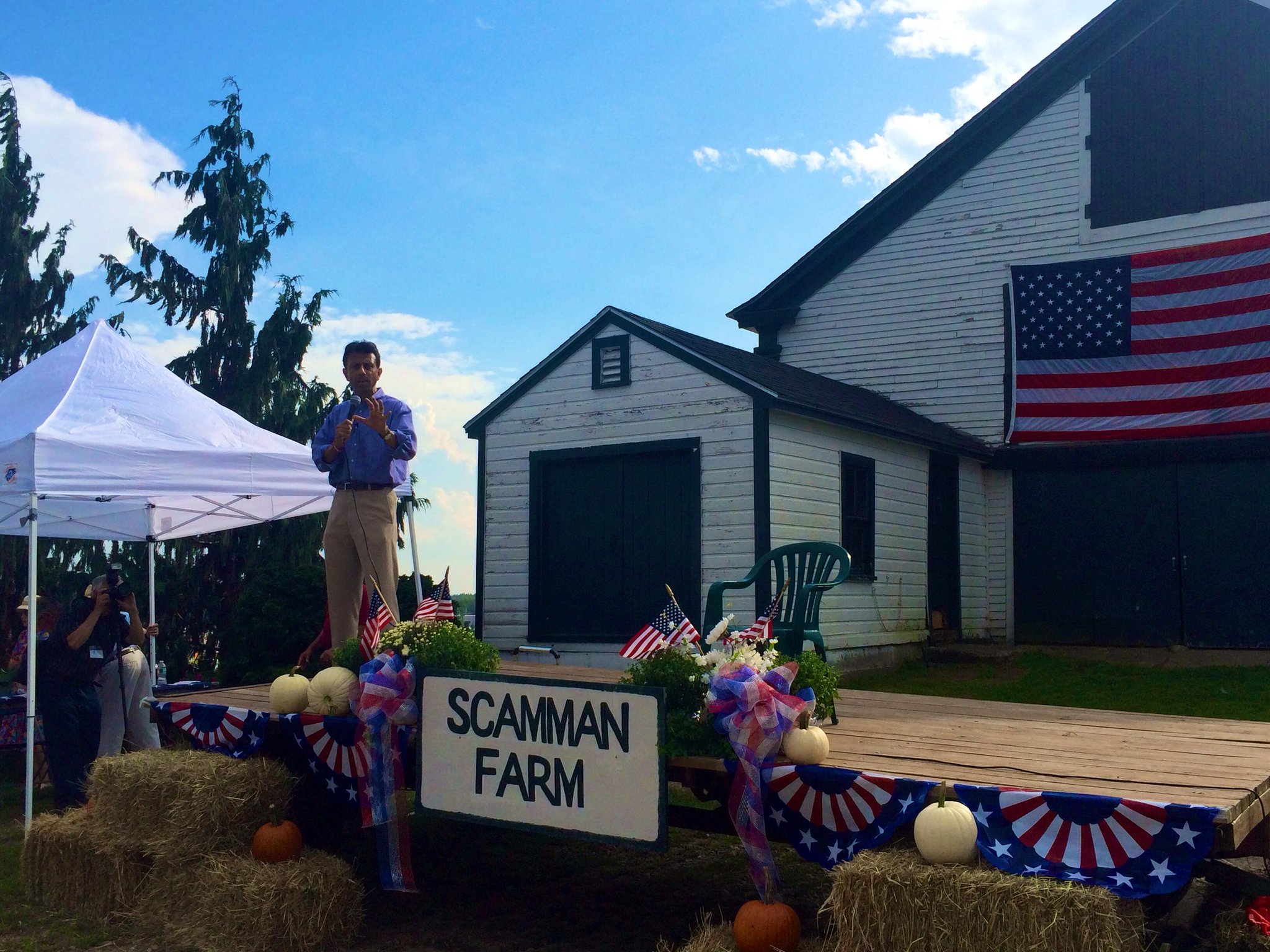 | Bobby Jindal habla subido a un carro de madera adornado con banderitas, calabazas y fardos de paja en una granja de Stratham, New Hampshire. (Foto: @BobbyJindal) |