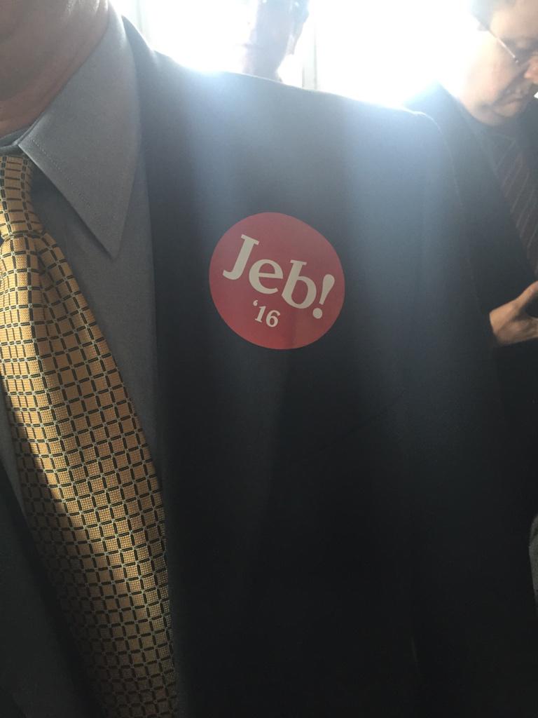 La pegatina con el lema "Jeb! '16" en letras blancas sobre fondo rojo que nos muestra Zeke Miller (Time) es de una recaudación de fondos a favor de Jeb Bush (R) que se celebró en Florida la semana pasada. El nombre de pila del ex gobernador de Florida, que en realidad es la unión de las iniciales de sus dos nombres y su apellido (John Ellis Bush), acompañado de un signo de exclamación, es la divisa electoral que utilizó en sus campañas en Florida, y personas de su entorno dicen que "esperan que adopte un diseño similar para su campaña presidencial," informa Philip Rucker en The Washington Post.