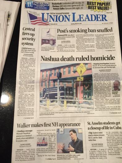 En cuanto a las portadas de la prensa local, una entrevista con Scott Walker salió ayer en la primera plana del Union Leader, el periódico más leído de New Hampshire con una tirada de 45,000 ejemplares diarios y 64,000 los fines de semana. Y lo que es más importante, es un diario conservador con una influencia especial sobre los votantes republicanos.