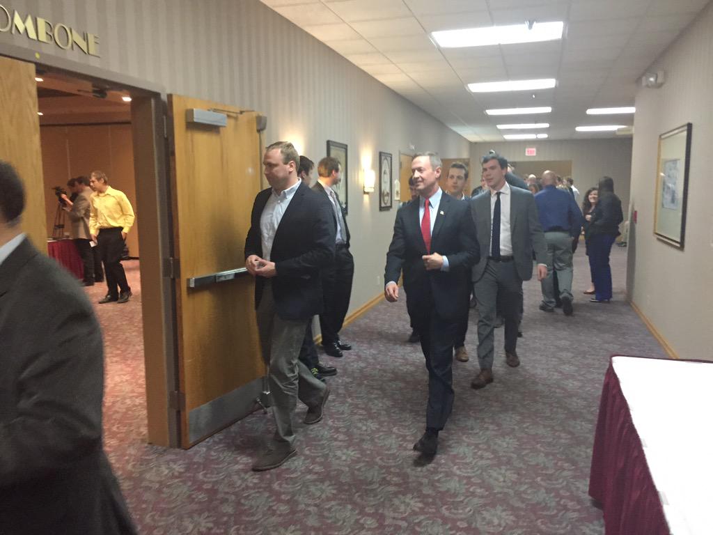 | Martin O'Malley llegando a una cena demócrata en Davenport acompañado del consultor Jake Oeth, el responsable de su operación preelectoral en Iowa. (Foto: @IAStartingLine) |