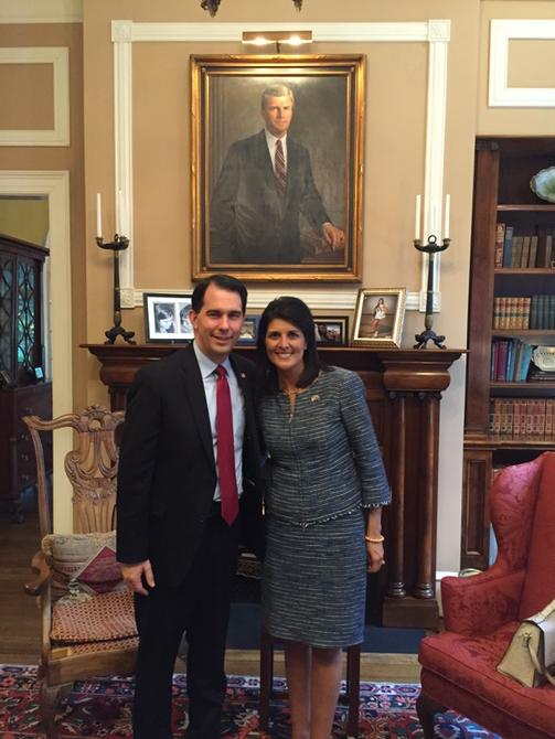 | De visita preelectoral en Carolina del Sur, el Gobernador de Wisconsin Scott Walker (R) ha posado esta mañana con su homóloga surcarolinesa, Nikki Haley (R), delante de un retrato de Carroll Campbell, uno de los gobernadores más populares de la historia de Carolina del Sur. |