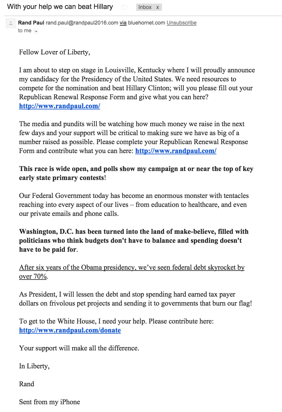 Paul ha enviado un email a sus partidarios para que sean los primeros en conocer sus intenciones. Les confirma que se presenta a Presidente y les pide dinero para "competir por la nominación y derrotar a Hillary Clinton." En el apartado de "Asunto" del email ha escrito: "Con vuestra ayuda podemos derrotar a Hillary."