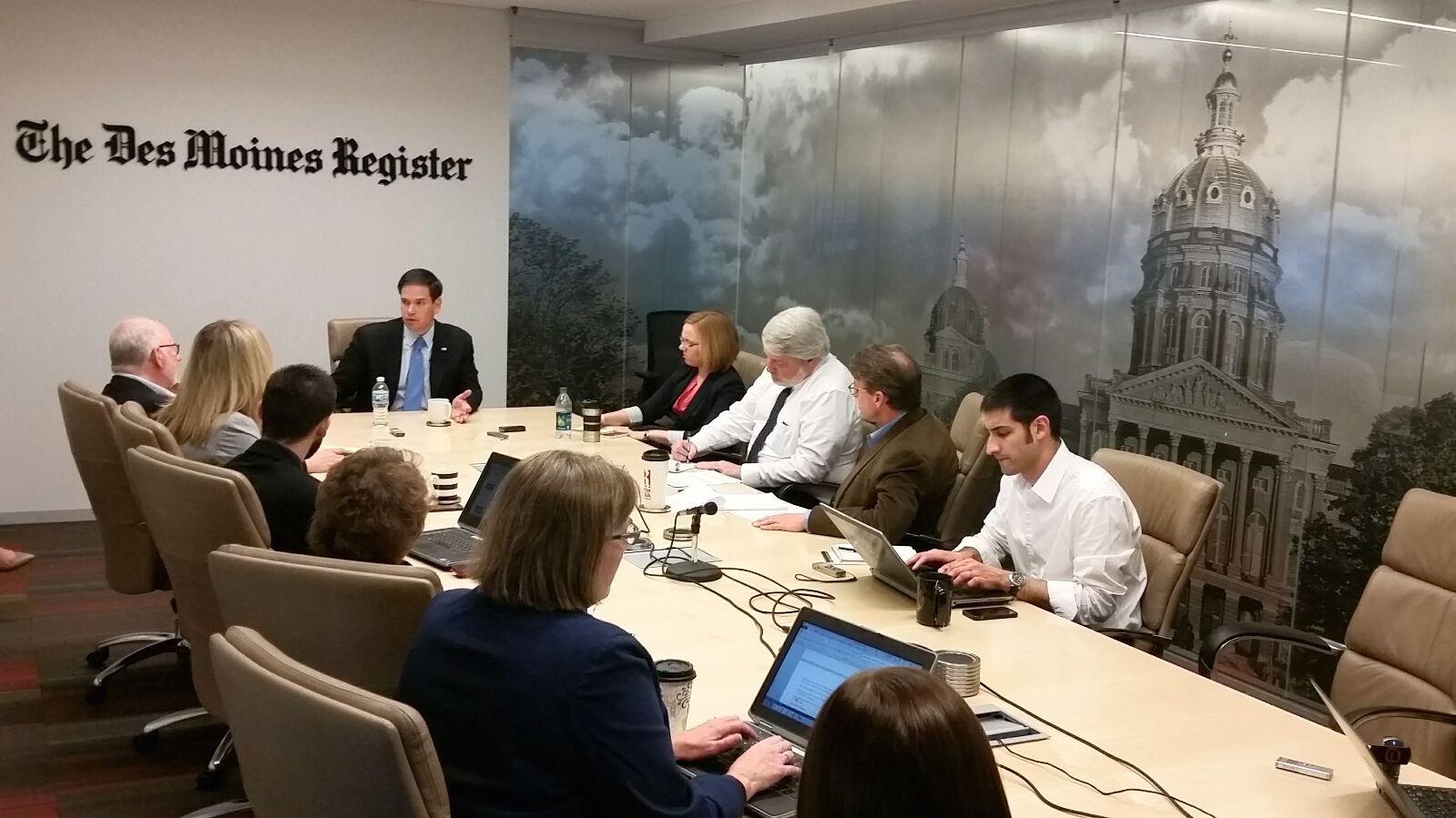 Marco Rubio (R) concedió ayer una entrevista a la junta editorial de The Des Moines Register, el periódico de mayor tirada en Iowa que ha ganado influencia entre los republicanos desde que en 2012 decidió apoyar a Mitt Romney después de 40 años apoyando a candidatos demócratas.