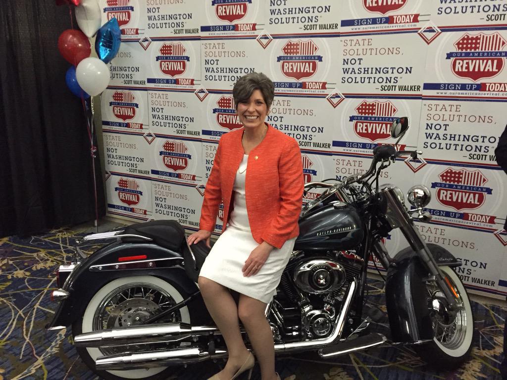 La Senadora Joni Ernst, de Iowa, posa con el Harley-Davidson de Scott Walker en la Cena Lincoln. (Foto: @PhilipRucker)