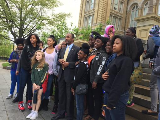 Más tarde, Carson visitó el Capitolio de Iowa y posó en sus escaleras con un grupo de jóvenes negras. (Foto: @RealBenCarson)