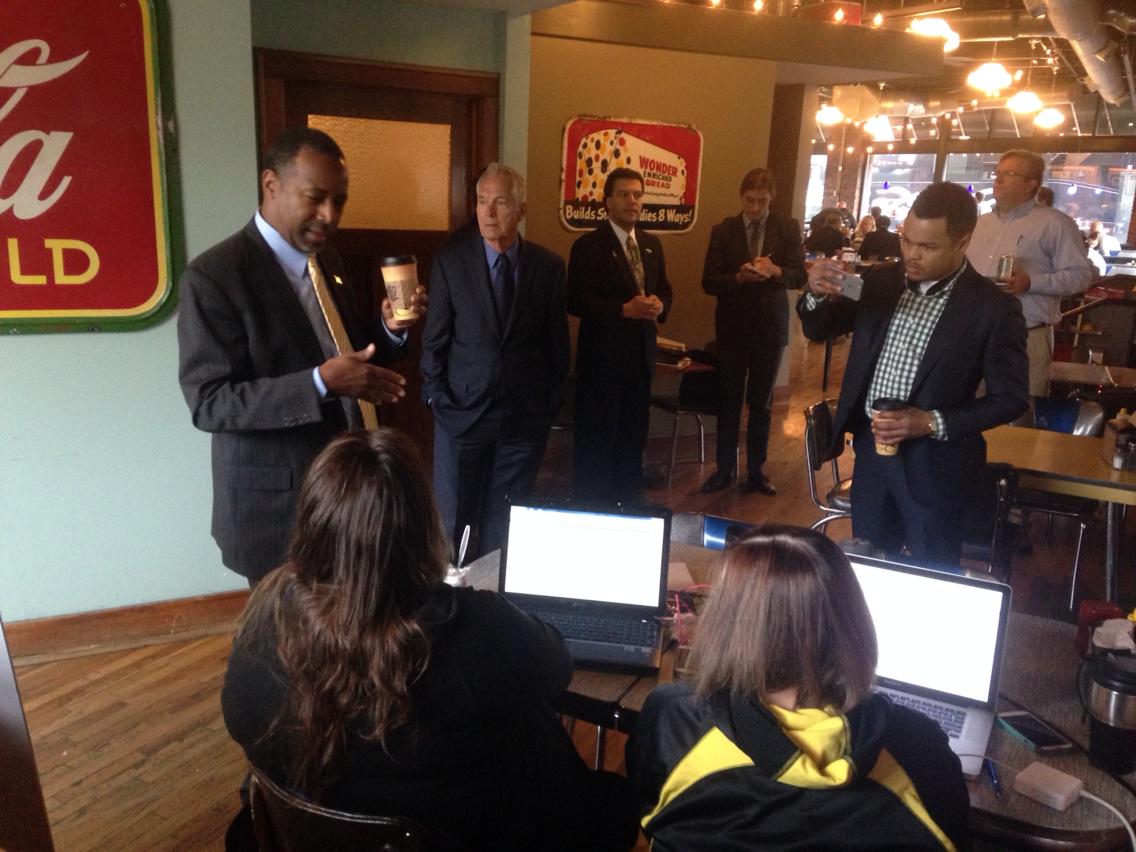 Ben Carson (R) visitó la cafetería Smokey Row de Des Moines.Smokey Row es una cadena de cafeterías muy popular en Iowa, con establecimientos en Des Moines, Oskaloosa y Pleasantville. Todo el que quiera ser Presidente tiene que hacer al menos una visita - Obama la hizo en Navidades de 2007. (Foto: @JenniferJJacobs)