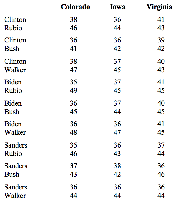 Bush es honesto para el 48 por ciento de los votantes de Colorado, y deshonesto para el 40 por ciento; Rubio es honesto para el 43 por ciento de los votantes de Colorado, y deshonesto solo para el 30 por ciento; y Walker honesto para el 40 por ciento y deshonesto para el 30 por ciento. Rubio y Walker son menos conocidos que Hillary y Bush.