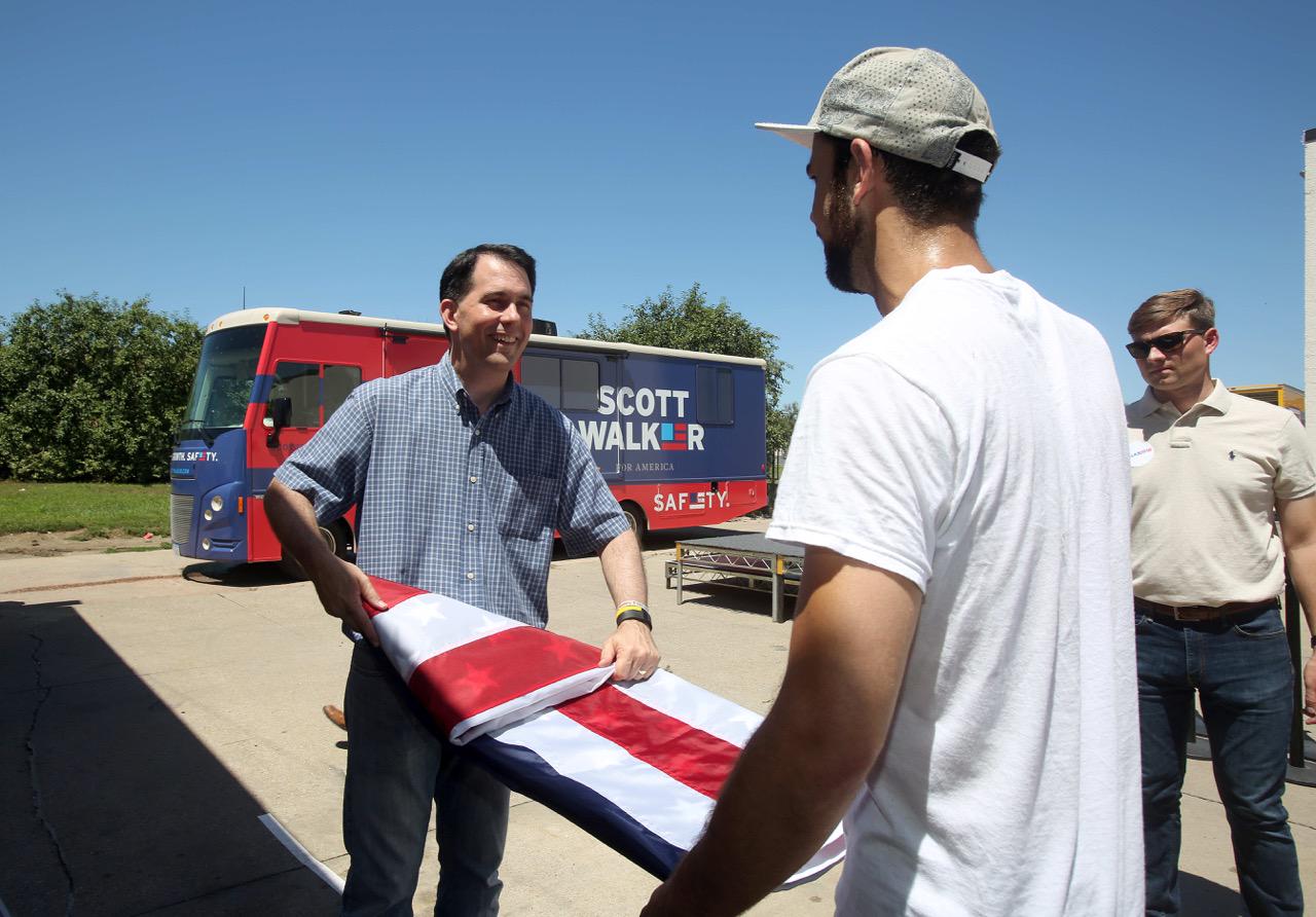 Scott Walker ayuda a doblar una bandera de EEUU después de un mitin en Sioux City. (Foto: @rick_wiley)