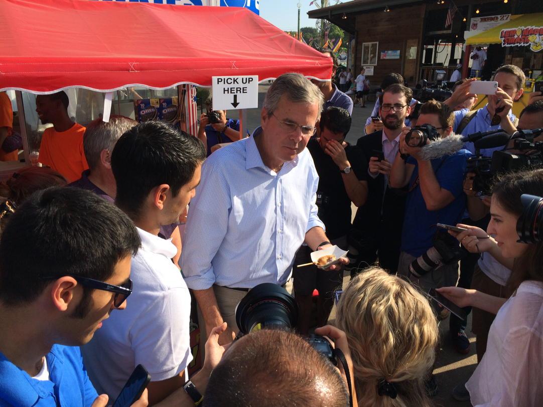 Antes de subirse a la tarima, el ex gobernador de Florida ha tomado un aperitivo empanado en harina de maíz y ha recorrido la feria estatal de Iowa acompañado de los Senadores Joni Ernst y Chuck Grassley. Con Ernst ha protagonizado un duelo de botas vaqueras ante los reporteros. Esto son por lo menos un par de puntos más en las encuestas de Iowa.
