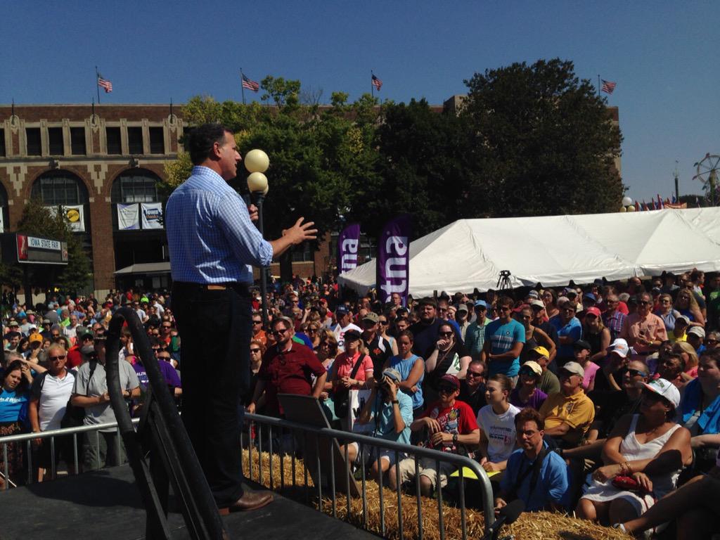 Procedente de una manifestación contra Planned Parenthood en el Capitolio estatal de Iowa, Rick Santorum (R) se ha subido a la tarima de la feria media hora más tarde de la hora prevista (ver vídeo).