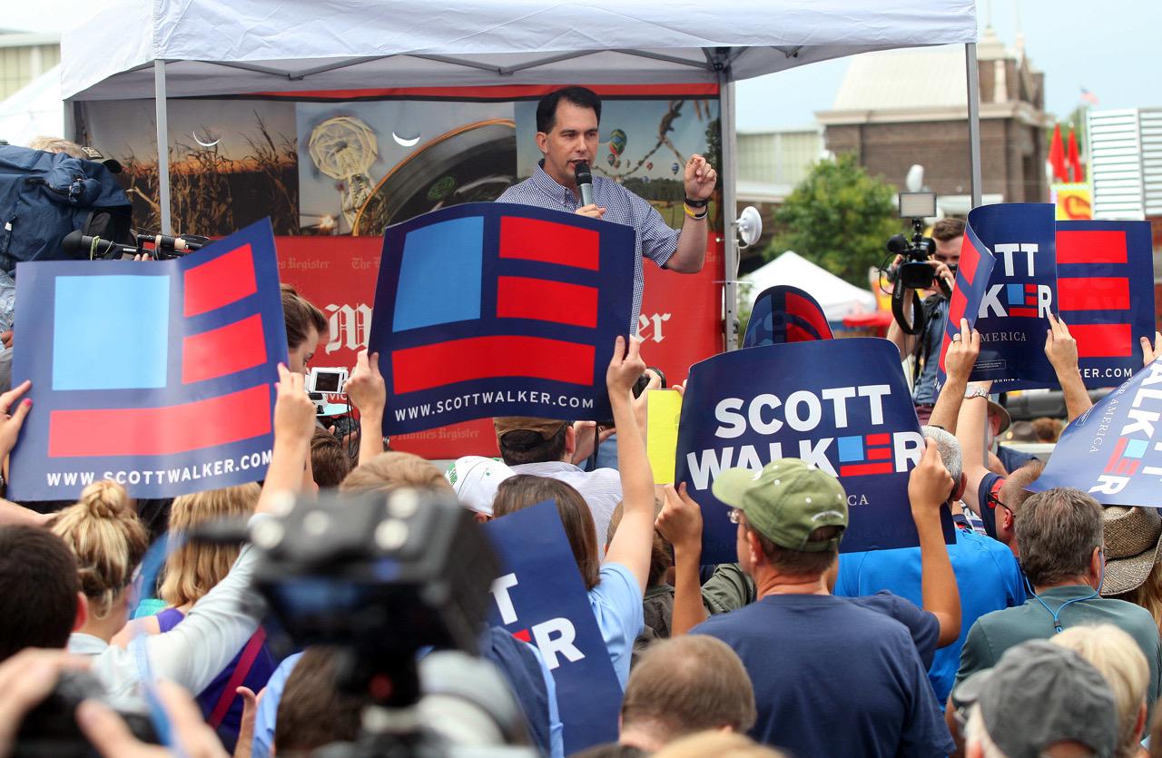 Walker cree que puede serle de ayuda enfrentarse a los activistas de sindicatos de funcionarios que le persiguen en todos sus viajes electorales. Normalmente evita enzarzarse con los manifestantes, pero el lunes no dudo en hacerlo en la feria estatal de Iowa, provocando una de las escenas con más pasión que hemos visto en la precampaña. Provocar más escenas como esa puede ayudarle con el tipo de votantes que está propulsando a Trump.