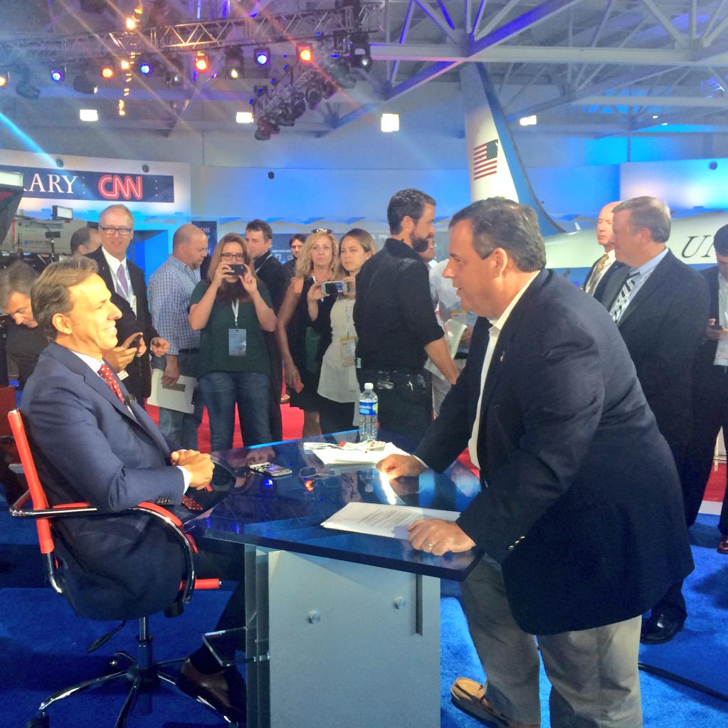 Chris Christie saluda al moderador Jake Tapper. (Foto: @betsy_klein)
