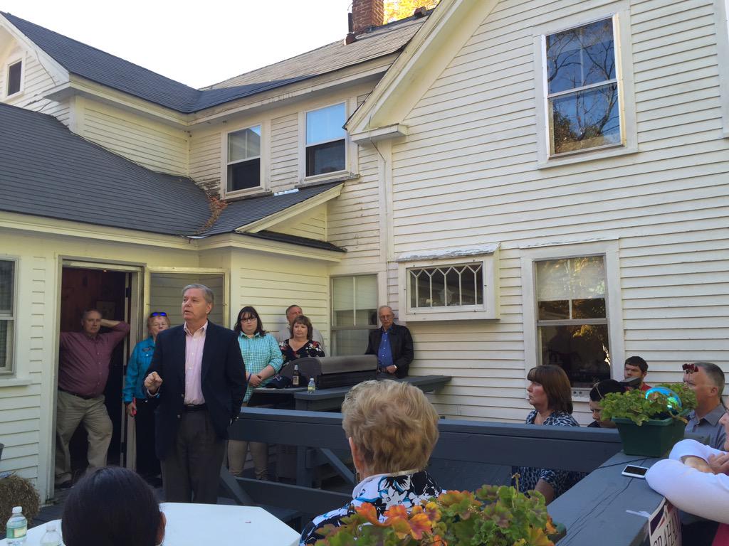 | El Senador John McCain presentó ayer a su colega y "mejor amigo para siempre" Lindsey Graham (R) en una house party en casa de Laurie y Shawn Jasper en Hudson, New Hampshire. Graham está realizando una gira de 10 días (desde el 7 de octubre hasta el 16 de octubre) por el estado de granito. (Foto: @TheBradMielke) |