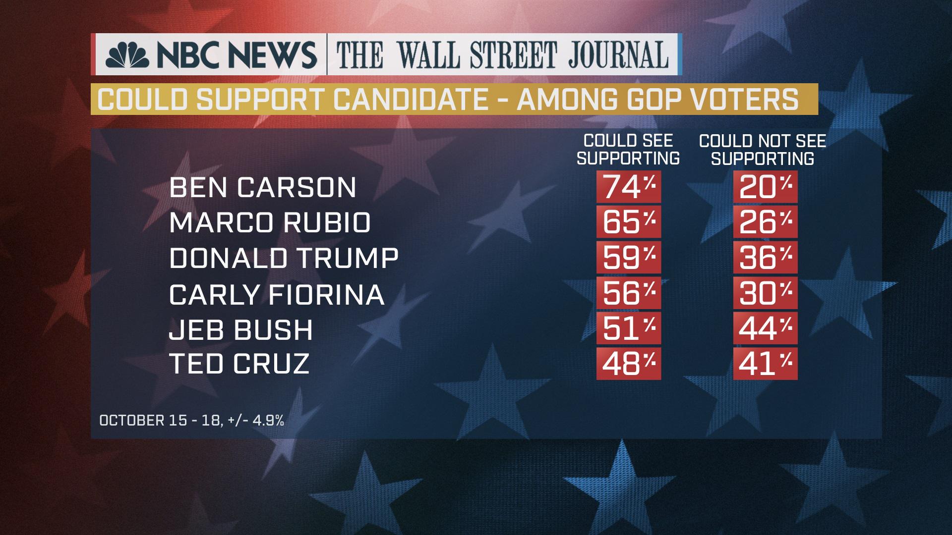 "Según esa medida de la aceptabilidad, Carson y Rubio lideran el pelotón y tienen el mayor potencial para atraer apoyos dentro del partido. El 74 por ciento de los votantes de las primarias republicanas dice que podría verse apoyando a Carson; el 65 por ciento dice lo mismo sobre Rubio."