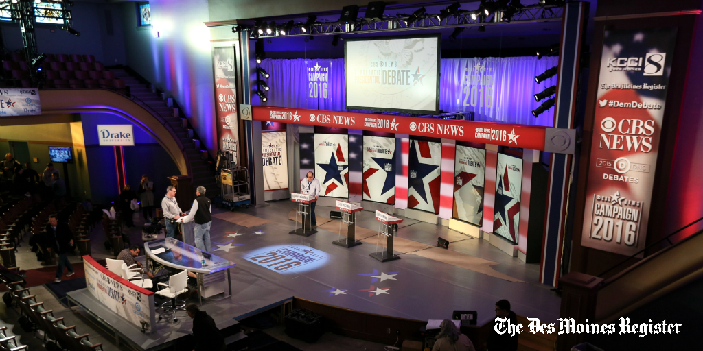 | Todo listo para el segundo debate demócrata en la Universidad Drake. (Foto: The Des Moines Register) |