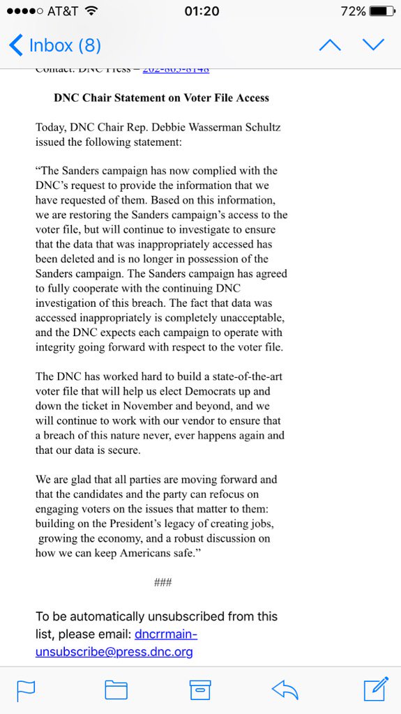 "La campaña de Sanders ahora ha obedecido a la petición del DNC de proveer la información que se les había pedido. Basándonos en esta información, restauramos el acceso de la campaña de Sanders al archivo de votantes, pero seguiremos investigando para asegurarnos de que los datos a los que se accedió inapropiadamente han sido borrados y ya no están en posesión de la campaña de Sanders," dice el Comité Nacional Demócrata en un comunicado que intenta zanjar este 'Watergate informático.'
