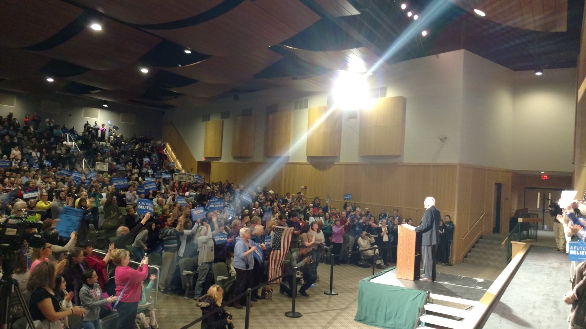 Unas 850 personas escucharon a Bernie Sanders (D) en Wolfeboro, New Hampshire hablar sobre las desigualdades económicos, los salarios bajos y la influencia de los millonarios que compran elecciones (ver vídeo).