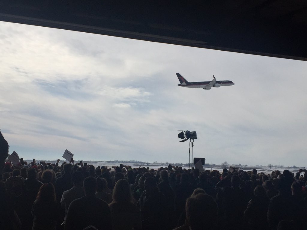 El súper avión de Súper Trump ha hecho una espectacular aparición sobre las cabezas de sus alborotados seguidores en el nevado aeropuerto de Dubuque, en el este de Iowa. De fondo sonaba el tema central de la película Air Force One.