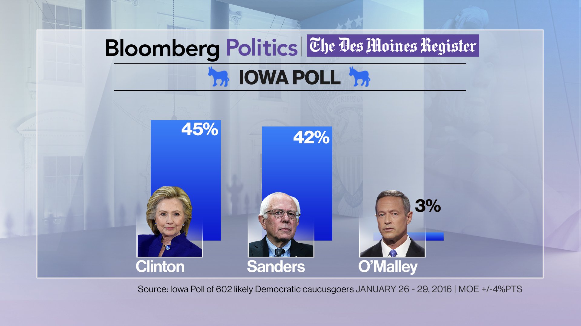 "Esta carrera es lo más igualada que puede ser," comenta David Axelrod, el estratega electoral de Barack Obama, el último candidato que ganó el caucus demócrata de Iowa. "Si Bernie Sanders tenía el 'momentum' entrando en el último mes, la carrera ahora está estática y esencialmente empatada."