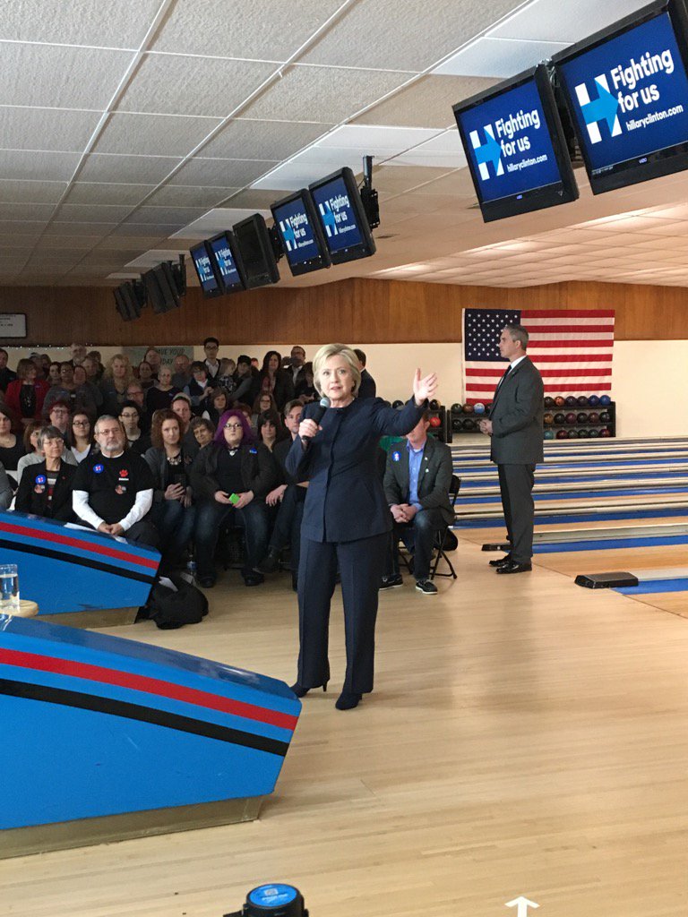 ¿A quién se le ocurre celebrar un acto electoral en una bolera del Medio Oeste y no hacer al menos una tirada de bolos y pedir unas patatas crujientes cubiertas de chili y salsa de queso fundido? Pues, entre otros, a Hillary Clinton (D). Una bolera estilo años 70 de Adel, Iowa ha recibido a la candidata engalanada con su logotipo electoral y el lema "Luchando por nosotros," pero Hillary no ha querido saber nada de pisar la superficie de juego y se ha limitado a dar una breve charla ante un grupo de votantes reunidos por el propietario Bryce Smith, un muchacho pelirrojo que tiene previsto utilizar su bolera para acoger uno de los cáucuses el próximo lunes.