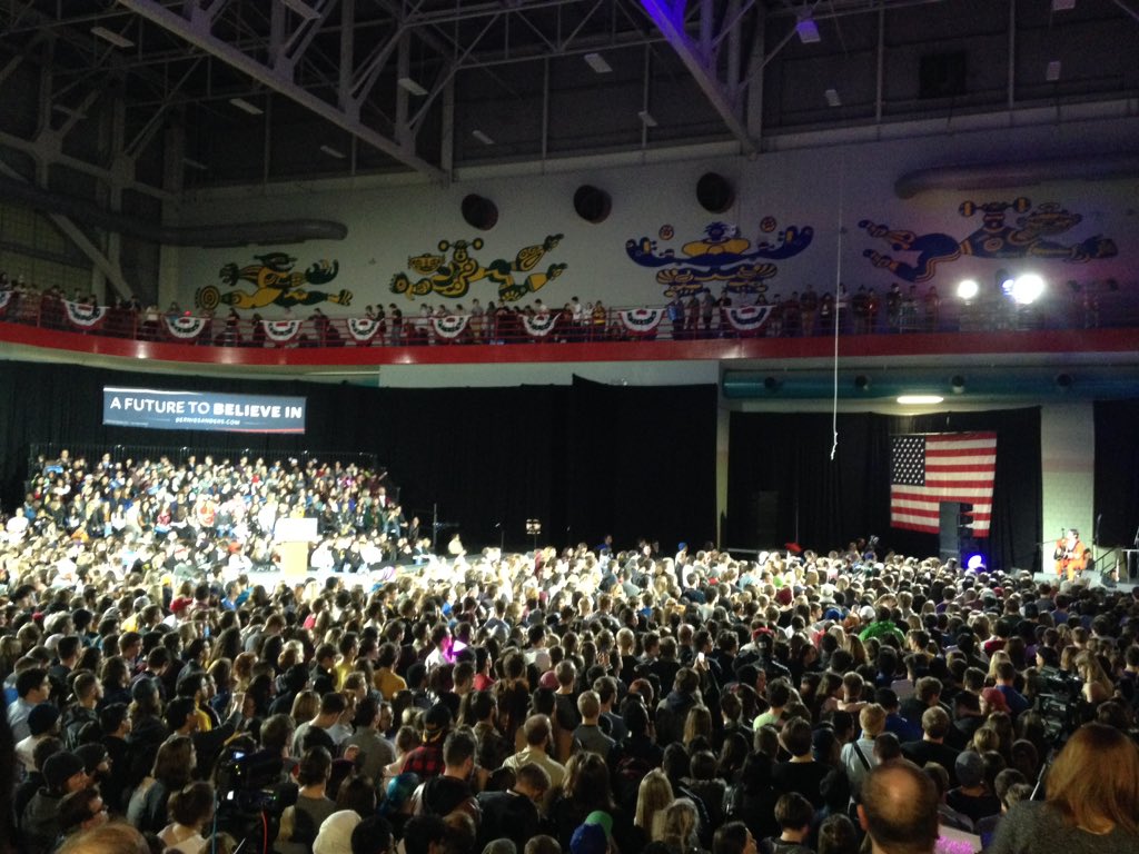 Crowd here in Iowa City as @BernieSanders comes on pic.twitter.com/67JlPMs645
