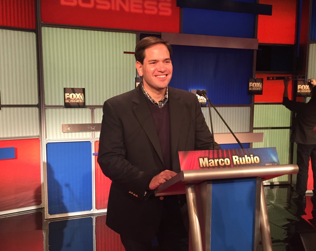 Para hacer el recorrido por el plató previo al debate, el Senador Marco Rubio ha prescindido del jersey de cuello de cremallera que le dio suerte las otras veces.