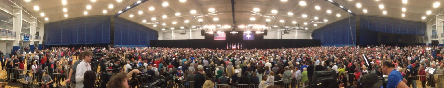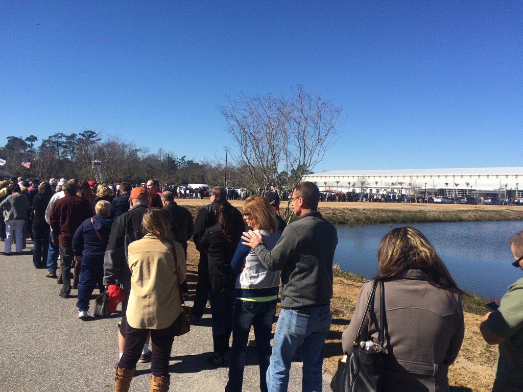 5,000 personas se han acercado a ver a Donald Trump (R) en Myrtle Beach, en la costa de Carolina del Sur ¡un viernes al mediodía! Creedme, no es normal reunir a ese número de personas a esa hora un día laborable y en época de primarias, en una ciudad de 27,000 habitantes. Trump ha llegado con más de una hora y media de retraso, pero a sus seguidores les da igual.