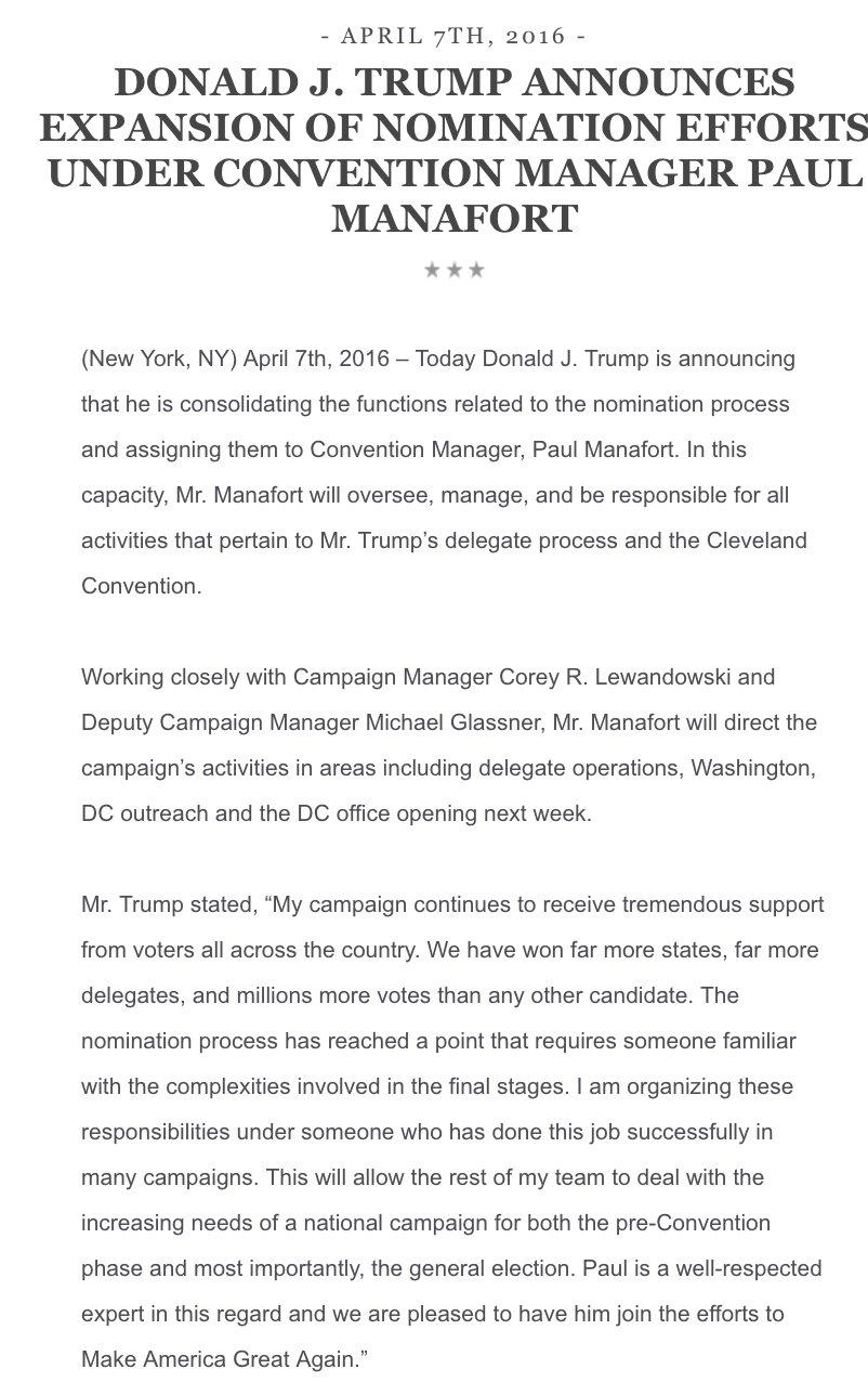 En un comunicado, Donald J. Trump (R) anuncia que el experimentado Paul Manafort (Ver biografía) "supervisará, dirigirá y será responsable de todas las actividades concernientes al proceso de delegados y la convención de Cleveland." Además, será el responsable de la "atención a Washington, DC" -traducido: relaciones con el establishment político republicano.