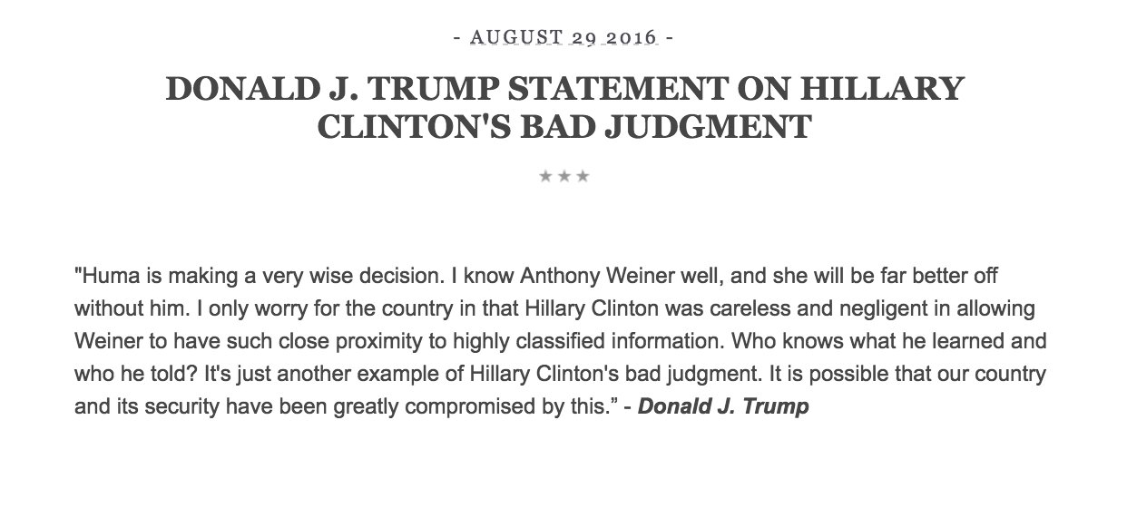 "Huma está tomando una decisión sabia. Conozco muy bien a Anthony Weiner, y ella estará mucho mejor sin él. Solo me preocupa por el país que Hillary Clinton haya sido descuidada y negligente dejando que Weiner tuviera proximidad a información altamente clasificada. ¿Quién sabe de lo que se habrá enterado y a quién se lo habrá contado? Es solo otro mal ejemplo del mal juicio de Hillary Clinton. Es posible que nuestro país y nuestra seguridad hayan quedado gravemente comprometidos por esto."